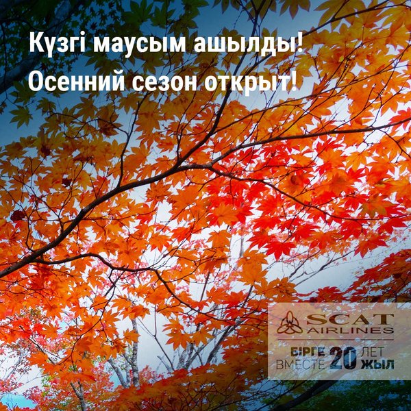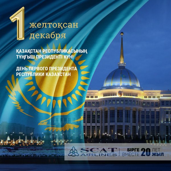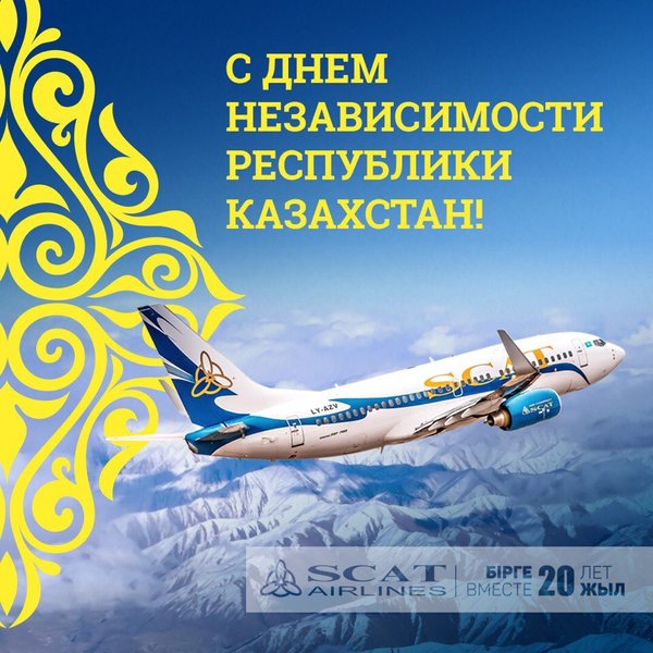 әртебе! Қымбатты Отандастар, Сіздерге зор денсаулық, тұрақтылық, өркендеу, сәттілік, отбасыларыңызға амандық, Қазақстан Республикасының игілігі үшін жемісті қызмет тілейміз! SCAT әуекомпаниясы 20 жыл бірге! Дорогие друзья! Примите наши поздравления с государственным праздником Днем Независимости Республики Казахстан! Этот праздник по праву считается символом свободы и могущества нашего государства. С момента обретения независимости наш народ блестяще продолжил великую историю Казахстана новыми достижениями и успешными преобразованиями, за годы независимости мы добились мирового признания и большого прогресса. Для нас- большая честь что АвиакомпанияSCATвносит вклад в развитие нашего суверенного государства своим упорным трудом, вот уже на протяжении 20 лет! Дорогие Казахстанцы, желаем Вам стабильности, процветания, крепкого здоровья, удачи, благополучия в семьях, успешной деятельности на благо нашей Республики Казахстан! Авиакомпания SCAT 20 лет вместе!