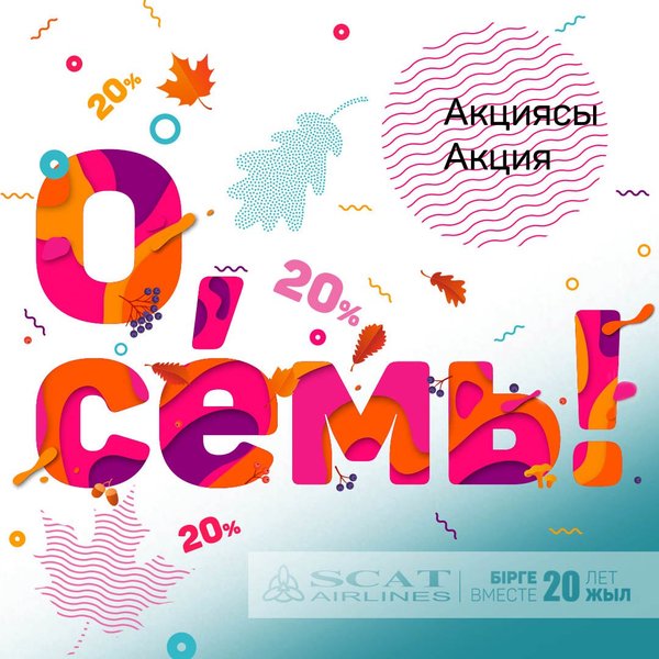 Акция «О,семь!» Осень радует нас яркими красками, а мы хотим порадовать вас яркими впечатления и подарками! В год нашего двадцатилетия, начиная с октября и на целых семь месяцев мы дарим скидку в 20% на рейсы авиакомпании SCAT! «О, осень » со вздохом скажите вы, а мы ответим что в этом году это позитивная «О,семь!» Отменяйте грусть и печаль, и спланируйте свои путешествия, эмоции, выходные дни и праздники вместе с авиакомпанией SCAT! Приобрести авиабилеты по специальной цене возможно во всех авиакассах вашего города, а также в круглосуточном режиме на официальном сайте компании scat.kz. Условия акции : 1. Период продажи с 18 по 30 сентября 2. Период перелета с 30 сентября по 25 марта 3. По акции не доступны рейсы в/из Москву, рейс Шымкент- Стамбул-Шымкент, а также рейсы интерлайн партнеров 4. Акция не распространяется на субсидированные чартерные рейсы 5.Возврат и перебронирование билетов осуществляется согласно классу приобретенного тарифа 6.Скидка не распространяется на льготные категории тарифов – детские, молодежные и пенсионные Авиакомпания SCAT – вместе 20 лет