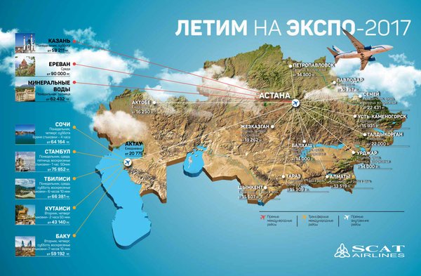 Сіз өзіңіздің әсерлеріңізбен бөлісе отырыңыз, ал біз сізге SCAT әуекомпаниясының рейстері көмегімен Астанаға қалай жетуге болатынын көрсетеміз. Біздің әуекомпания Қазақстанның барлық қалаларын қамтуға тырысып, Қазақстанның 16 қаласынан тікелей рейстерді қарастырды, шетелдік туристер үшін Алматы және Астана қалаларында ыңғайлы түйісулер қарастырылған!