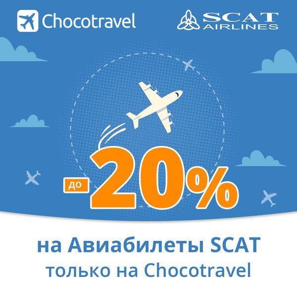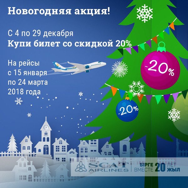 е көптеген рейстерді орындайды. Өз бағытыңызды таңдап, біздің ерекше мерекелік ұсынысымызды пайдаланыңыз! Ұшу уақыты 2017 жылғы 15 қаңтардан бастап 2018 жылдың 24 наурызына дейін, билеттер саны шектеулі, ұшуларды сатып алуға асығыңыз және SCAT әуекомпаниясымен бірге саяхаттаңыз! SCAT әуекомпаниясы — 20 жыл бірге! Дорогие друзья! Новый год уже совсем скоро, поэтому, встречайте новогоднюю акцию от авиакомпании SCAT! С 4 по 29 декабря действует уникальная скидка -20% на перелеты SCAT Airlines! В год своего 20-летия, мы хотим подарить вам возможность путешествовать всю зиму с праздничными скидками. Обрадуйте визитом своих близких, отправляйтесь в деловую поездку или просто в увлекательное путешествие вместе со SCAT Airlines. Авиакомпания SCAT- лидер по объему сети маршрутов по Казахстану, а также выполняет множество регулярных рейсов в страны ближнего и дальнего зарубежья. Выберете именно свой маршрут и воспользуйтесь нашим уникальным праздничным предложением! Период перелета с 15 января 2017 года по 24 марта 2018 года, количество билетов ограничено, успейте приобрести перелеты и путешествуйте с авиакомпанией SCAT! Авиакомпания SCAT 20 лет вместе!