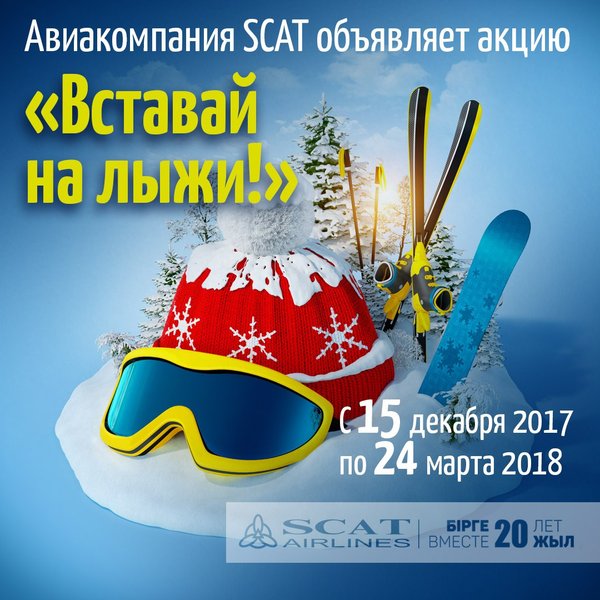 месе 2) Бір жұп шаңғы, бір жұп шаңғы таяқтар, бір жұп шаңғы аяқ киімі; -Келесі жиынтықтарға нормативтен тыс багаж тарифтері бойынша тиісті қосымша төлем қабылданатын болады. — шаңғы жабдықтарын тасымалдау әуе компаниямен алдын ала келісу арқылы жүзеге асырылады. SCAT әуе компаниясымен 20 жыл бірге! ___ Доргие друзья! Пришла зима. Весь Казахстан накрыло белоснежной пеленой. Это отличный повод для горнолыжных катаний! Авиакомпания SCAT объявляет акцию «Вставай на лыжи!. С 15.12.2017 по 24.03.2018 г. на всех прямых и трансферных регулярных рейсах провоз лыжного оборудования, не зависимо от размеров (не больше 32кг на одно место) осуществляется бесплатно! Условия: -Предметы должны быть упакованы в чехол для лыжного снаряжения -В состав лыжного оборудования включено: 1) Одна лыжная доска (сноуборд), одна пара лыжной обуви; или 2) Одна пара лыж, одна пара лыжных палок, одна пара лыжной обуви; -За последующие комплекты будут принимать соответствующую доплату по тарифам сверхнормативного багажа. — Перевозку лыжного оборудования осуществлять при предварительном согласовании с Авиакомпанией Авиакомпания SCAT 20 лет вместе!