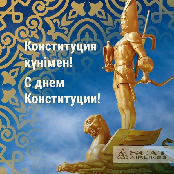 Құрметті қазақстандықтар! Еліміздің басты мерекелерінің бірі — Конституция күнімен Өздеріңізді шын жүректен құттықтаймыз! 30 тамыз — мемлекетіміздегі айтулы күндердің бірі. Ата Заңымызды қабылдау Тәуелсіз еліміздің еңсесін тіктеп, оның дамуы мен тұрақтылыққа жету жолында, әрбір отандасымыздың еркіндігі мен құқығының сақталуында үлкен рөл атқарды. Көпұлтты мемлекетіміздің болашағы ондағы әрбір тұрғынның заң алдындағы теңдігі мен құқықтарының қамтамасыз етілуі, азаматтық келісім және бейбітшіліктің сақталуымен тығыз байланысты. SCAT әуе компаниясы баршаңызды Конституция күнімен құттықтай отырып, отбасыларыңызға бақ, береке тілейді!