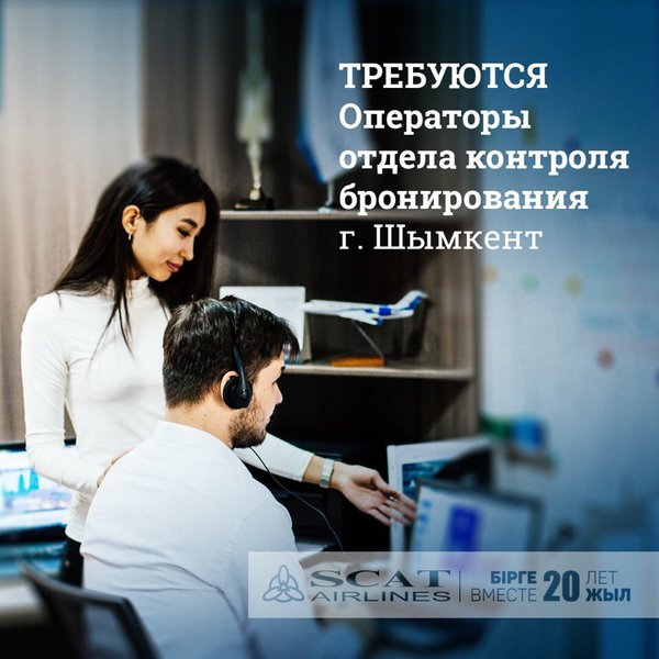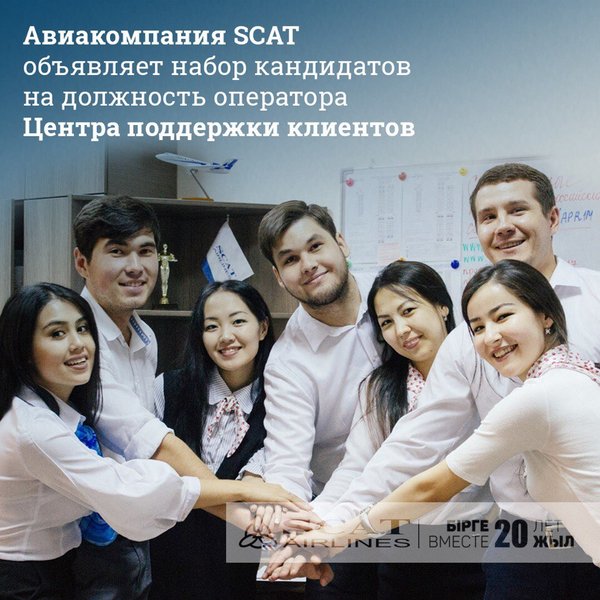 ебования к кандидатам операторов Центра поддержки клиентов: знание казахского, русского и английского языка (минимальный уровень Intermediate), владение другими иностранными языками приветствуется; умение вести диалог, соблюдение этики общения; желание обучаться новым навыкам; хорошая дикция и коммуникативные навыки; эмоциональная компетентность; стрессоустойчивость; умение работать в коллективе; Дружный коллектив авиакомпании SCAT, будет рад ответственным, позитивным и целеустремленным людям! Резюме отправлять на электронный адрес n.karibayeva@scat.kz