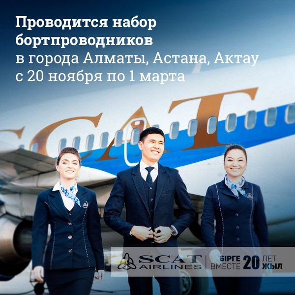 Дорогие друзья! В связи с расширением географии полетов наша авиакомпания объявляет набор бортпроводников с 20 ноября по 1 марта в городах Алматы, Астана и Актау. Для участия в конкурсе необходимо отправить резюме на sbpplan@scat.kz В резюме необходимо указать следующее: 1) ФИО 2) Рост, вес 3) Город проживания 4) Знание языков 5) Возраст 6) Умение плавать 7) Если имеются тату или шрамы- необходимо указать 8) Контактные данные 9)Снимок во весь рост К письму приложить свои диплом, характеристику и мотивационное письмо
