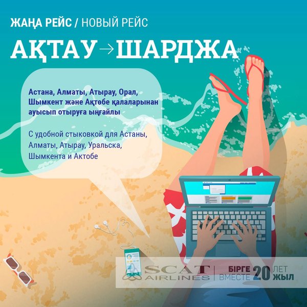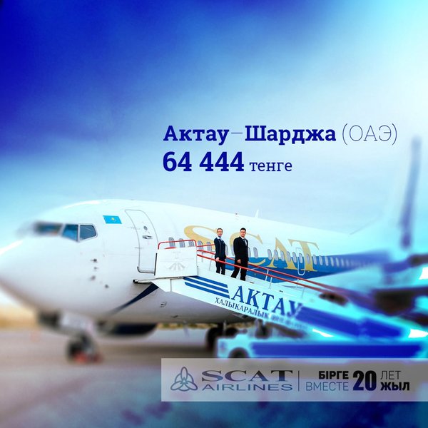 жұмыс істеуге қуаныштымыз. «SCAT» әуекомпаниясы — 20 жыл бірге! Дорогие друзья, Успейте приобрести билеты на новое регулярное направление в третий по величине город Объединённых Арабских Эмиратов, популярное курортное место, расположенное на берегу Персидского залива — город Шарджа. Рейс будет выполняться дважды в неделю, каждый четверг и воскресенье. Удобные стыковки из 7 городов Казахстана. Время в пути- три часа. Приобрести билеты вы можете уже сейчас на нашем сайте а также во всех агентствах вашего города. Подробную информацию о времени вылетов и всех доступных тарифах смотрите на сайте авиакомпании Мы рады работать для вас. Авиакомпания SCAT- 20 лет вместе!