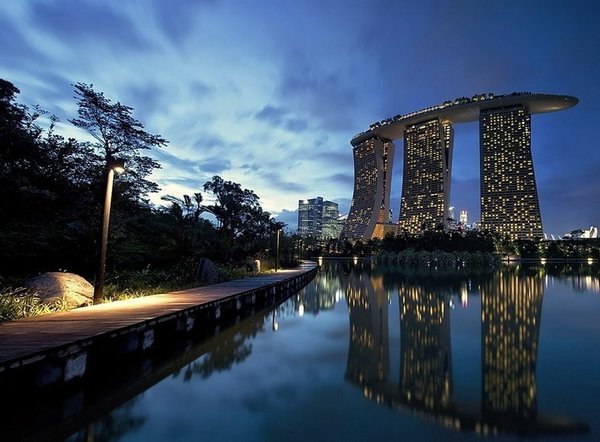 Вечерний вид на отель Marina Bay Sands, Сингапур