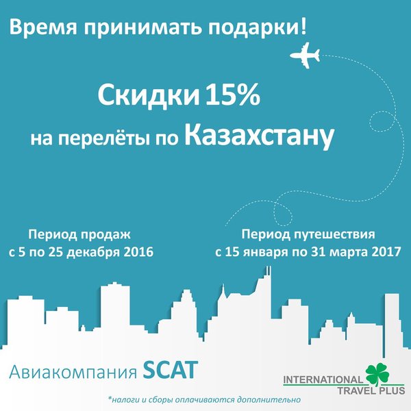 Время принимать подарки, а также покупать билеты выгодно! Авиакомпания SCAT сообщает о начале акции -15% на перелёты по Казахстану В канун Нового года самое время запасаться подарками для самых близких и родных! Лучший подарок — это скидки на авиабилеты! Период продаж с 5—25 декабря 2016 года Период путешествия с 15 января по 31 марта 2017 года *налоги и сборы оплачиваются дополнительно *Более подробную информацию о расписании, а также о стоимости авиабилетов в тенге, включая сборы можно узнать у наших авиа-агентов Алматы Астана Атырау Актау… — Читать дальше