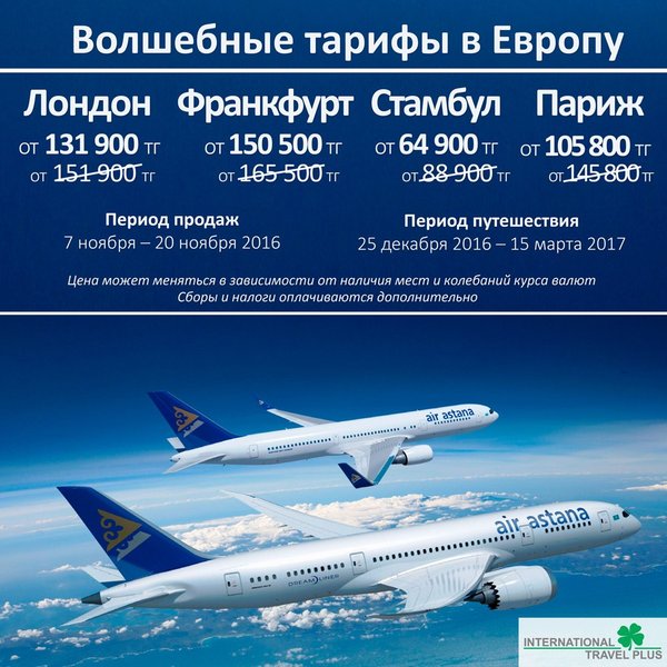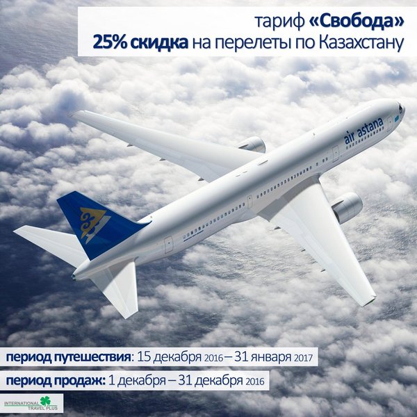 лет включительно действует скидка 99% от тарифа (cборы и налоги оплачиваются дополнительно) Период продаж: 7 ноября – 20 ноября 2016 Период путешествия: 25 декабря 2016 – 15 марта 2017 Максимальное пребывание: 1 месяц Правила тарифа: – изменение даты вылета: 40$ за каждый меняемый компонент – неявка на рейс: 50$ – авиабилет невозвратный (исключение в случае отказе в визе) – для детей от 2 до 11 лет включительно действует скидка в размере 99% от тарифа Сборы и налоги оплачиваются дополнительно Максимальное количество детей на одного взрослого пассажира – 5 – несопровождаемые дети: скидка в размере 75% от тарифа Сборы и налоги оплачиваются дополнительно – комбинирование с другими видами тарифов разрешается Цена может меняться в зависимости от наличия мест и колебаний курса валют Количество мест ограничено Более подробную информацию о направлениях, расписании, а также о стоимости авиабилетов в тенге, включая сборы, можно узнать у наших авиа-агентов Алматы Астана Атырау Актау Актобе Еще больше новостей и акций от авиакомпаний читайте на нашем сайте
