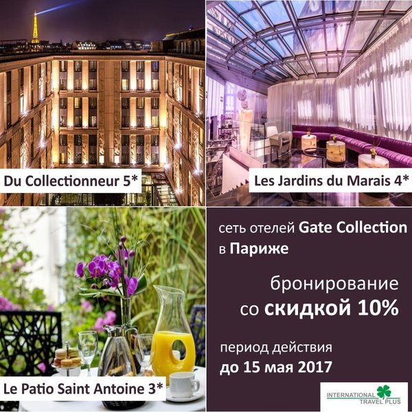 Отдыхайте в Париже выгодно! Сеть отелей Gate Collection в Париже предлагает скидки 10% на проживание в отелях Du Collectionneur 5*, Les Jardins du Marais 4*, Le Patio Saint Antoine 3* Период действия предложения до 15 мая 2017 Еще больше информации по телефонам: Алматы Астана Атырау Актау Актобе