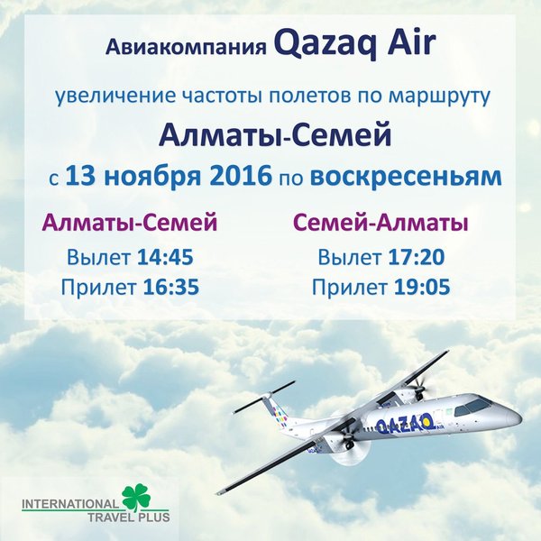 Приятные новости для тех, кто летает из Алматы в Семей! Авиакомпания Qazaq Air сообщает об увеличении частоты полетов, начиная с 13 ноября 2016 по воскресеньям! Полёты будут выполняться на региональном комфортабельном самолете Bombardier Q400 NextGen по следующему расписанию Алматы-Семей Понедельник; Вылет в 09:20; Прилет в 11:10 Суббота; Вылет 09:20; Прилет в 11:10 Воскресенье; Вылет в 14:45; Прилет в 16:35 Семей-Алматы Понедельник; Вылет в 11:55; Прилет в 13:45 Суббота; Вылет в 11:55; Прилет в 13:45 Воскресенье; Вылет в 17:20; Прилет в 19:05… — Читать дальше