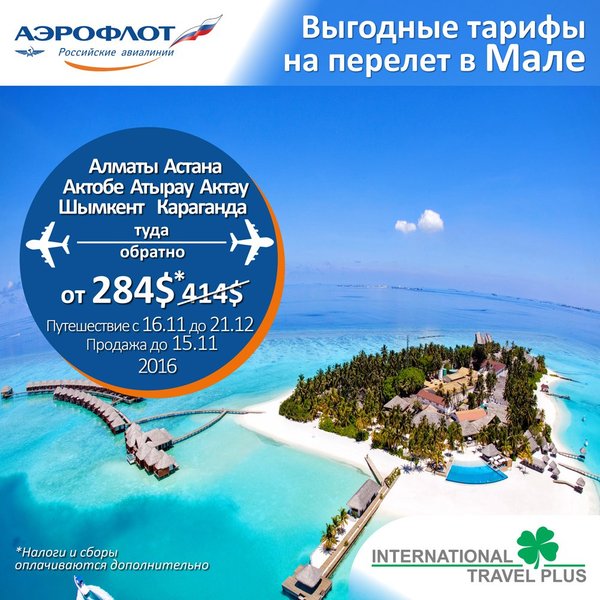 Для тех, кто мечтает провести каникулы на Мальдивах! Авиакомпания Аэрофлот предлагает своим пассажирам выгодные тарифы на путешествие из городов Казахстана в Мале, столицу солнечной Мальдивской Республики Тариф на перелет от 284$ – перелет туда и обратно – период продаж до 15 ноября 2016 – период путешествия с 16 ноября до 21 декабря 2016 Города вылета: Алматы, Астана, Караганда, Атырау, Актау, Шымкент, Актобе Обратите внимание на то, что налоги и сборы оплачиваются дополнительно Цена может меняться в зависимости от наличия мест и колебаний кур… — Читать дальше
