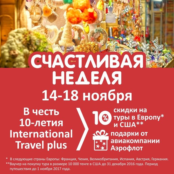 Дорогие друзья! Вот и наступил первый день счастливой недели! Торопитесь закружиться в рождественском хороводе и насладиться новогодней атмосферой Европы и США! Только до 18 ноября мы дарим 10% скидки на интересные и вкусные туры в Европу и США, а также не пропустите приятные бонусы и подарки при покупке билета в Европу и США на рейсы авиакомпании Аэрофлот! Мы ждем вас в наших офисах в Алматы, Астане, Актау, Актобе и Атырау! Алматы Астана Атырау Актау Актобе