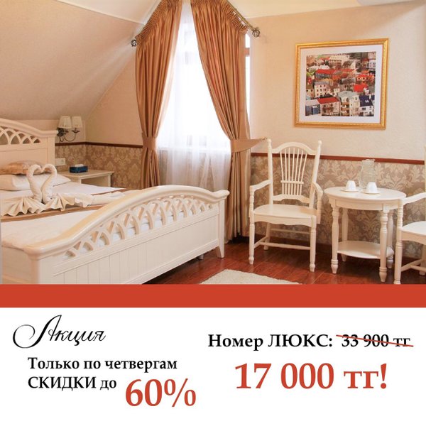 -50% в мае Акция! Проживание 8,9,10,11 мая со скидкой 50%! Мы ждем вас! В стоимость входит: 1 сутки проживания для двоих; завтрак; массаж на массажном кресле; парковка. В номерах бесплатно предоставляются: гигиенические наборы; халаты, тапочки, WI-FI, сейф и чайные наборы. Номера оборудованы телевизорами со спутниковыми каналами, санузлами класса люкс и минибарами. Обслуживание в номерах до 23:00. Делюкс 16950 тенге проживание +завтрак Супериор, минисупериор 13800 тенге проживание + завтрак Стандарт 11300 тенге проживание+ завтрак