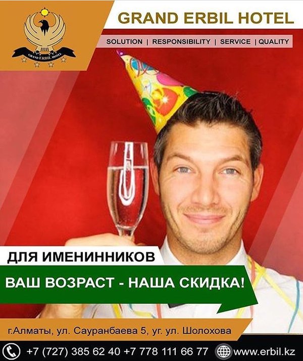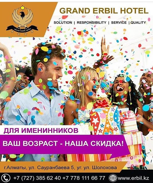 Дорогие друзья! Grand Erbil Hotel Для всех именинников приготовил подарок! Получи скидку на проживание в отеле в свой День рождения. Сколько лет, столько и скидка!