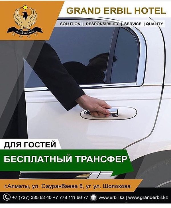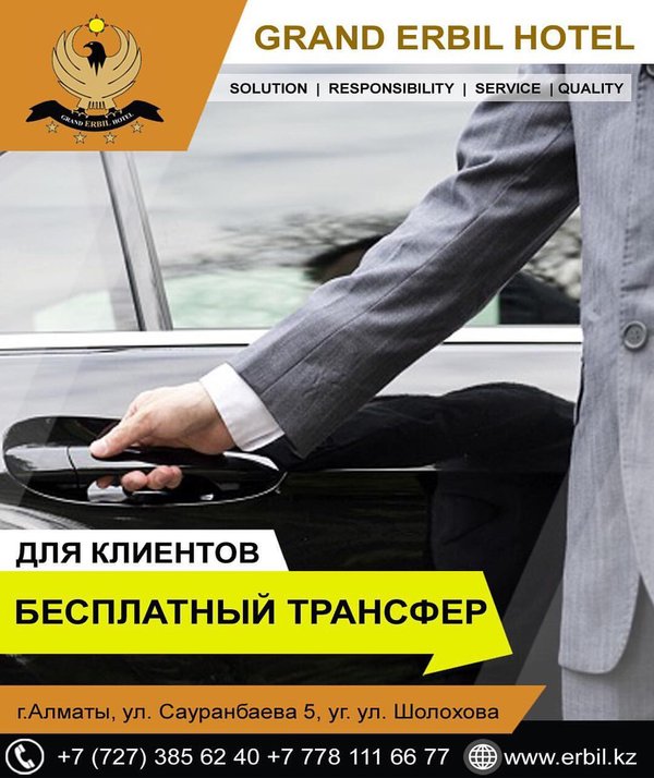 Grand Erbil Hotel совершит бесплатный трансфер из любой точки Алматы в нашу гостиницу, при условии проживания не менее 1 суток. Ждем Ваших звонков.
