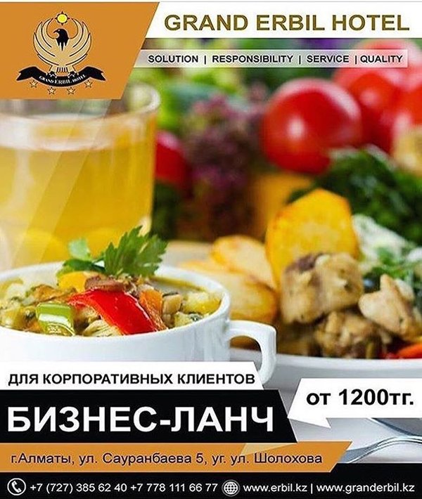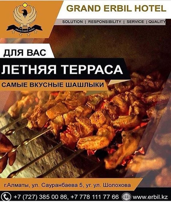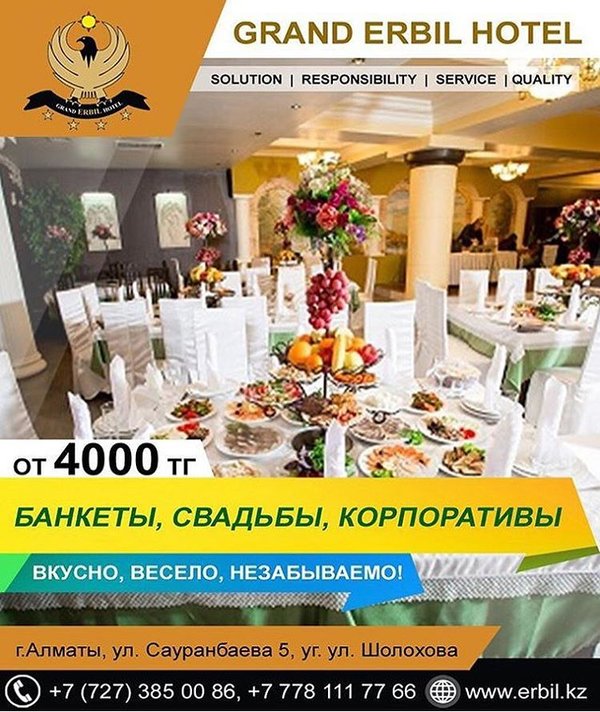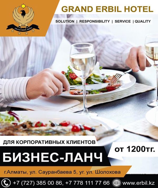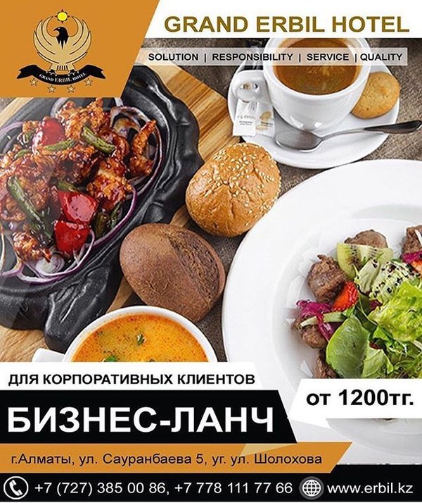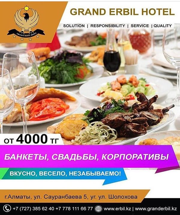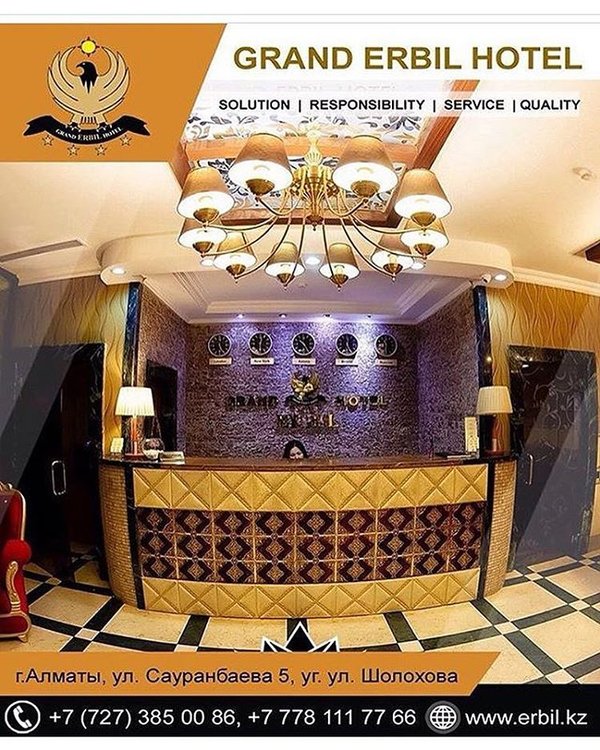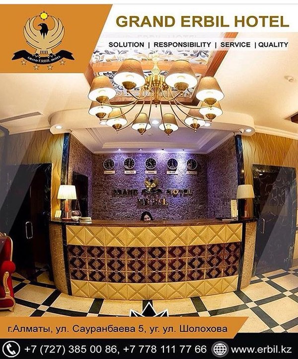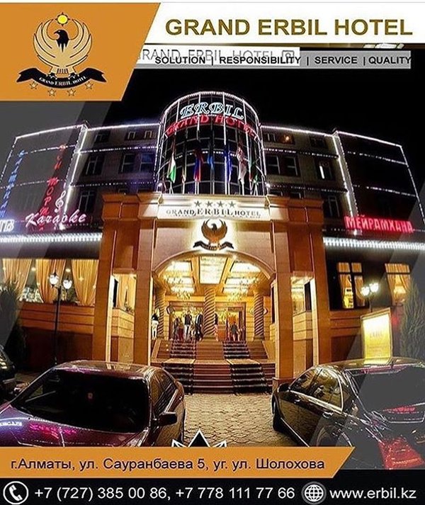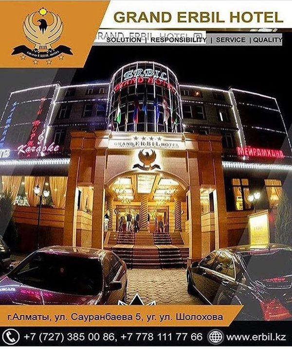 GRAND ERBIL HOTEL» — четырехзвездочный гостиничный комплекс, к Вашим услугам предлагает просторные уютные номера с индивидуальной системой климат-контроля, круглосуточным доступом к сети Internet (Wi-Fi), спутниковым телевидением, телефоном с прямой линией связи, мини-баром. Ресторан и летнюю террасу «ГРУЗИЯ ФИЛЬМ», SPA (бассейн, хамам, финская сауна, бильярд) все в Вашем распоряжении при оплате только за номер (от 12 000 тенге)!!! Наши менеджеры ответят на все ваши вопросы:,
