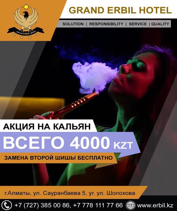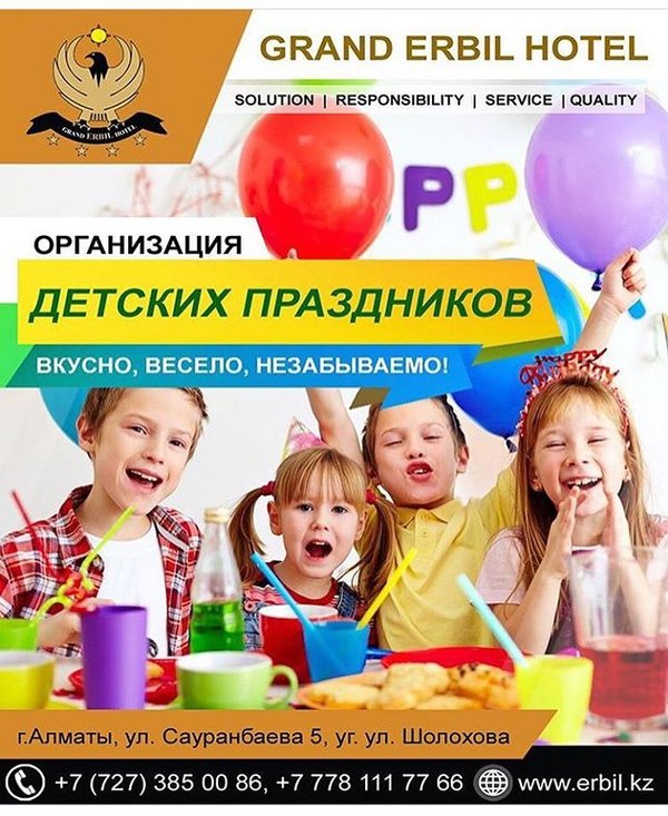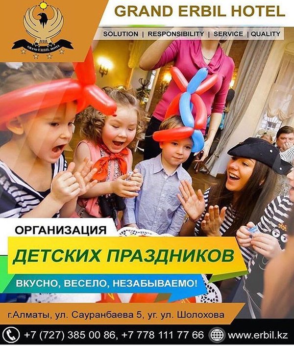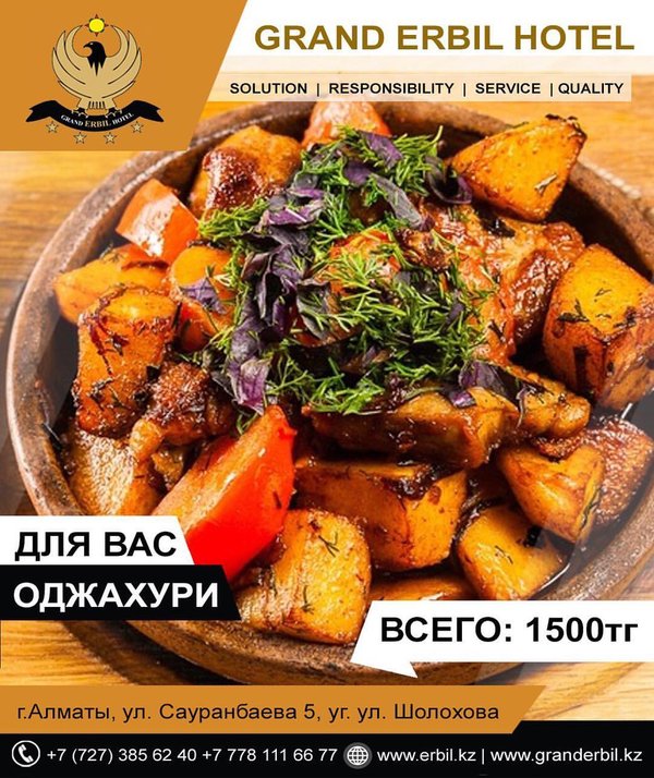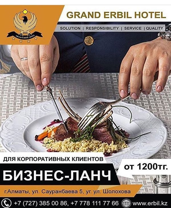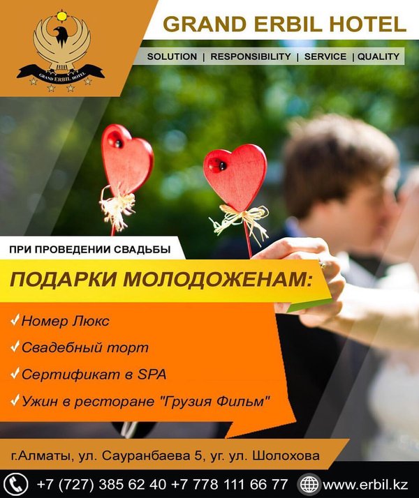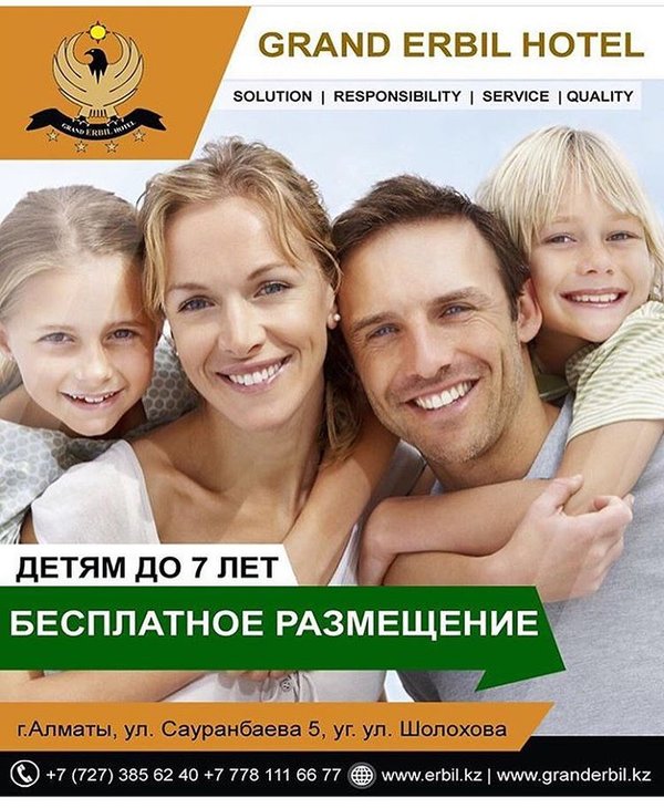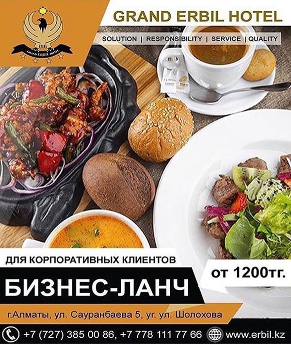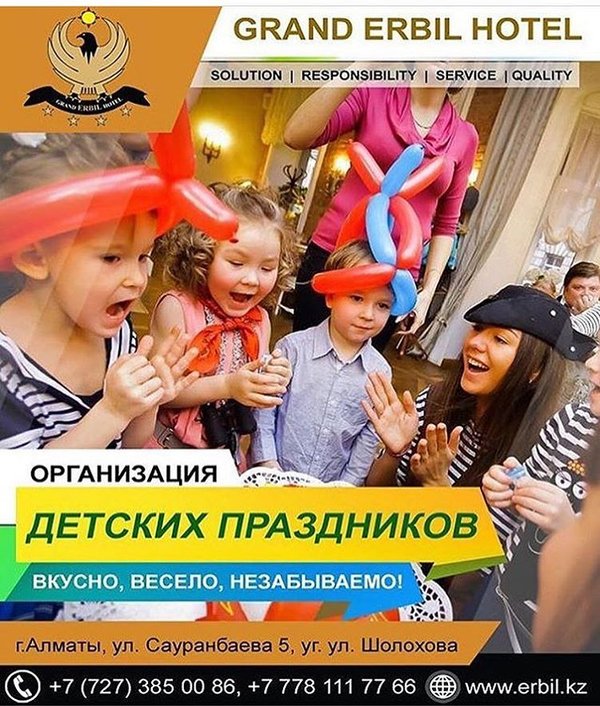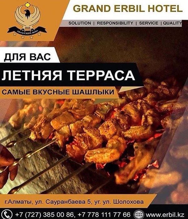 GRAND ERBIL HOTEL» — четырехзвездочный гостиничный комплекс, к Вашим услугам предлагает просторные уютные номера с индивидуальной системой климат-контроля, круглосуточным доступом к сети Internet (Wi-Fi), спутниковым телевидением, телефоном с прямой линией связи, мини-баром. Ресторан и летнюю террасу «ГРУЗИЯ ФИЛЬМ», SPA (бассейн, хамам, финская сауна, бильярд) все в Вашем распоряжении при оплате только за номер (от 12 000 тенге)!!! Наши менеджеры ответят на все ваши вопросы:,