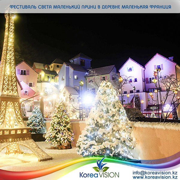 о вы совершили путешествие в сказочную страну. Вас ждет: — Световая иллюминация, световой туннель — Уличное освещение, как на одной из улиц Франции Монпелье — Танцевальное представление с марионетками, музыкальная шкатулка, уличные музыканты — Парад марионеток и танцевальное представление — Кукольное представление марионеток «Пиноккио» — Различные мастер-классы (изготовление кукол-марионеток своими руками, изучение гипсового искусства: изготовление поделок, связанных с персонажем произведения «Маленький принц») — Волшебная атмосфера деревни «Маленькая Франция» (мелодичное звучание музыкальной шкатулки, выступление уличных музыкантов, показ французских кинофильмов) Адрес: 1063, Hoban-ro, Gapyeong-gun, Gyeonggi-do (пров. Кёнги-до, уезд Капхён-гун) 경기도 가평군 청평면 호반로 1063 (청평면) 01.12.2017 ~ 28.02.2018 Стоимость билета Стоимость участия в культурных программах: взрослые 8 000 вон, школьники 6 000 вон (ученики средней и старшей школ), дети 5 000 вон