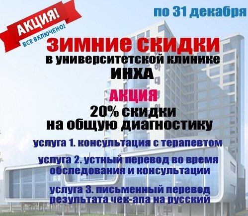 Доброго времени суток!) Лечу в Корею с 08 по 15 мая) Есть желающие пройти чек ап (диагностику)?) Повезу в лучшую клинику Кореи Расскажу и покажу самые лучшие места в Корее Напоминаю стоимость комплексных диагностических пакетов в Корее (от 400—3000$). Прохождение диагностики 1—2 дня. Результаты на 3й день Все быстро и качественно Welcome to Korea P.S. Первым откликам предусмотрена скидка
