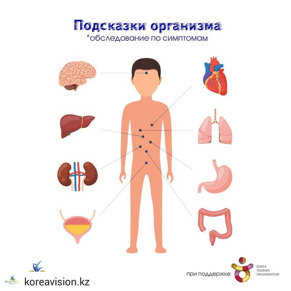 людалось. Проверка зрения, тест на определение полей зрения, обследование глазного дна, исследование клинической рефракции глаза. ⠀ ЗОБ: ощущается комок в горле. Учащенное сердцебиение. Плохая переносимость холода Тесты функции щитовидной железы, УЗИ щитовидной железы, коронарография. ⠀ ЛЕГКИЕ: частая одышка, кашель, выделение мокроты, боль в боку Рентгенограмма грудной клетки. Исследования функции легких. ⠀ СЕРДЦЕ: приходящая боль в груди во время физических упражнений. Учащенный либо слабый пульс. Затрудненное дыхание. Отечность в ногах. Кардиография. Эхокардиография. Коронарография. ⠀ ПЕЧЕНЬ: желтизна в глазах, плохая свертываемость крови. Тест для проверки функции печени, УЗИ печени. Проверка на гепатит. ⠀ ЖЕЛУДОК: колющие боли и вздутие. Плохое переваривание. Изменение цвета мочи, рвота. Гастроскопия. Ангиография желудка. ⠀ ТОЛСТАЯ КИШКА: изменение цвета стула иногда с кровью. Толщина кала — тонкая. Колонография толстого кишечника. Ректальная эндоскопия кишечника. Анализ калла. ⠀ ПОДЖЕЛУДОЧНАЯ ЖЕЛЕЗА: употребление большого количества воды из-за чувства жажды. Повышенное потребление пищи. Частое мочеиспускание. Тест на сахар. ⠀ ПРОСТАТА. ПРЕДСТАТЕЛЬНАЯ ЖЕЛЕЗА: слабый напор при мочеиспускании. Частое мочеиспускание. Чувство неполного освобождения мочевого пузыря. Ректальное обследование. Трансректальная эхография. Анализ мочи. УЗИ на рак предстательной железы. ⠀ СУСТАВЫ: ощущение «жесткости» в руках по утрам. Отечность или боль в суставах. Тест на ревматоидный фактор. Рентген сустава. ⠀ Всю полезную информацию о Южной Корее вы можете узнать на @kntoalmaty