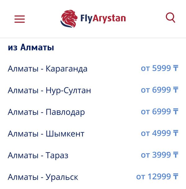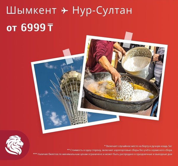 й (вт., чт.), Кызылорда (пн., пт.); от 9999* тенге четыре раза в неделю – в Шымкент (вт., чт., пт., вс.); от 11 999* тенге три раза в неделю – в Караганду (вт., ср., сб.); от 12 999* тенге дважды в неделю – в Нур-Султан (чт., вс.); от 14 999 * тенге дважды в неделю – в Алматы (пн., сб.). *Цены минимальные, указаны в один конец, включают случайное место на борту и 5 кг ручной клади. Багаж, питание и выбор места на борту оплачиваются дополнительно по необходимости и желанию пассажира. Очень важно планировать путешествия на лоукост компании заранее. Не все билеты могут быть по одной цене. Чем ближе дата вылета, тем дороже их цена, особенно в праздничные, выходные дни и летом. Багаж также следует покупать заранее, иначе в аэропорту пассажирам придется оплачивать за каждый килограм веса, что обойдется в несколько раз дороже. Приобрести билеты вы можете на сайте: