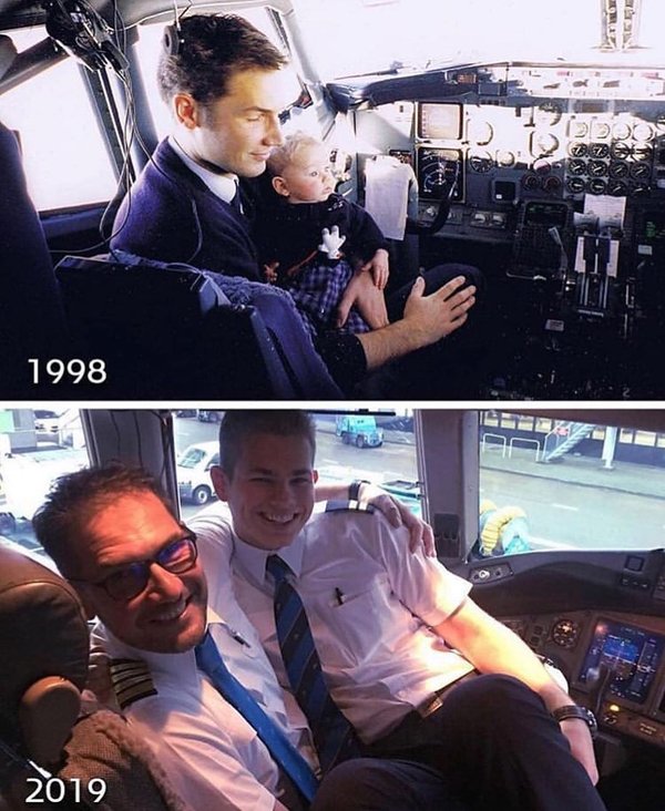 «Пусть ваши мечты сбываются!» Бас и его отец в кабине Boeing 737, в январе 1998, и января 2019 года. Он пошел по стопам своего отца, и 20 лет спустя, он второй офицер KLM на Boeing 777. Первый полет Баса с отцом произошел в январе 2019 года. Его мама была стюардессой на том же рейсе.
