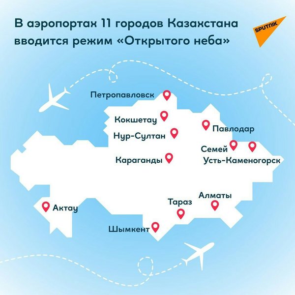 ️Казахстан дал больше свободы иностранным авиакомпаниям. В 11 городах сегодня введен режим «открытого неба». Пассажирам от этого одни плюсы: запустятся новые направления для полета увеличится частота рейсов снизится цена на авиабилеты Теперь небо открыто в Нур-Султане, Алматы, Шымкенте, Актау, Караганде, Усть-Каменогорске, Павлодаре, Кокшетау, Таразе, Петропавловске, Семее.
