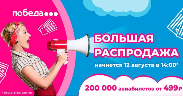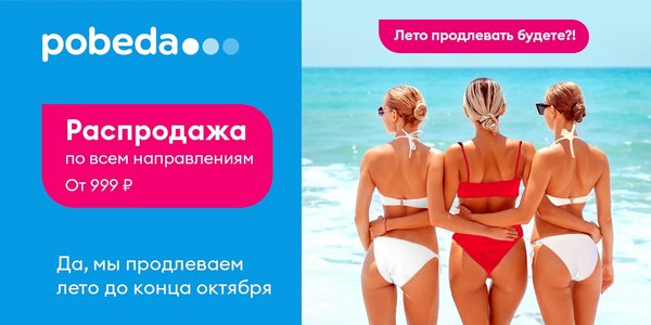 ПРОДЛЕВАЕМ ЛЕТООО! Победа запускает распродажу по всем российским направлениям! Только 4 дня! Успейте купить билеты от 999 ₽ БРОНИРУЙТЕ 17 августа — 20 августа 2020 ЛЕТИТЕ 1 сентября — 26 октября 2020