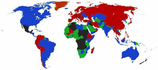 Страны на карте окрашены в цвета их паспортов. Всего 4 цвета: красный, синий, зеленый, чёрный.