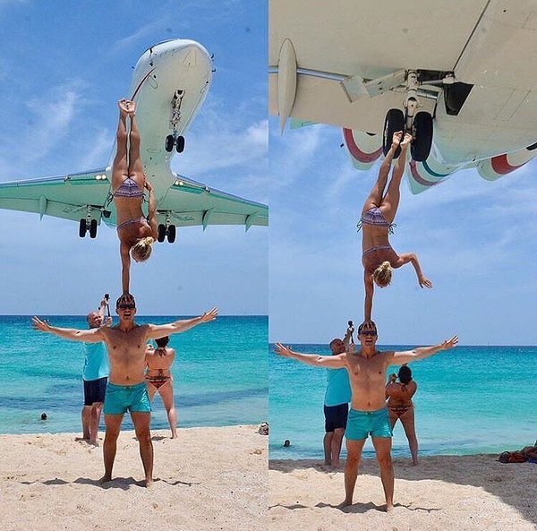 Невероятное фото в Синт-Мартен, пляж Махо! Эта фотография не фейк, никто не был в опасности во время фото (между человеком и самолетом было безопасное расстояние)