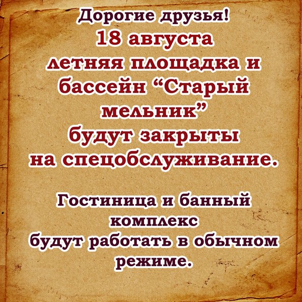 Дорогие друзья. 18 августа Летняя площадка и бассейн «Старый Мельник» будут закрыты на спецобслуживание. Гостиница и банный комплекс будут работать в обычном режиме. Благодарим за понимание.