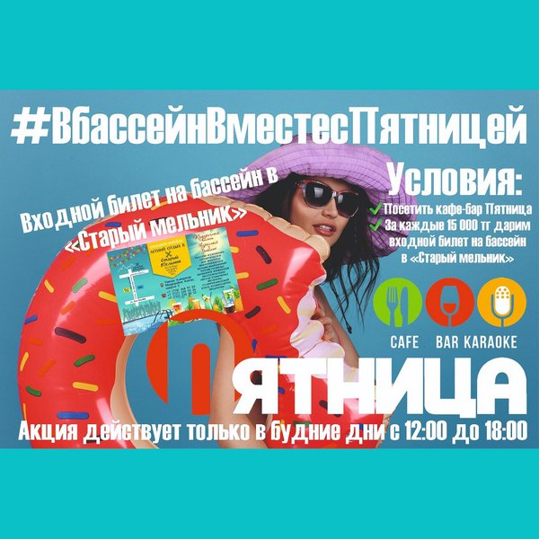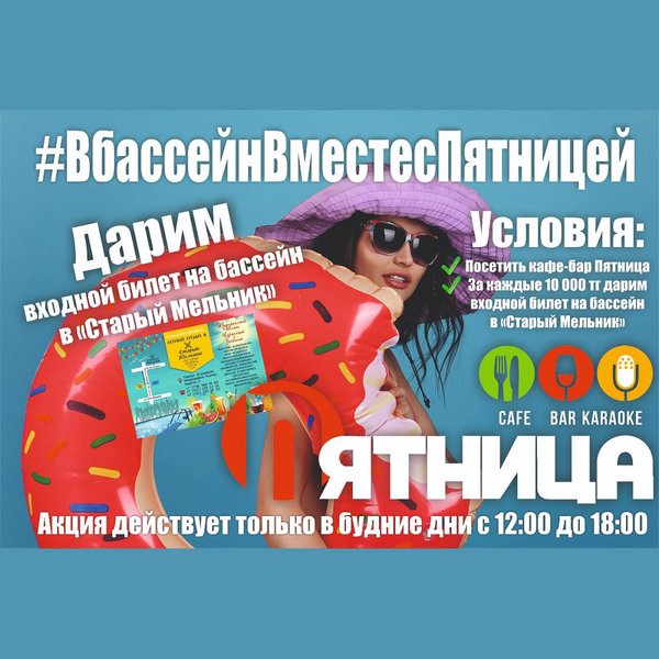 Дорогие ниши друзья! У Вас появилась уникальная возможность получить подарочный сертификат на посещения Бассейна «Старый Мельник! Условия совершенно просты: Посетить кафе «Пятница» На каждые 15 000 Вы получаете подарочный сертификат в Бассейн. Акция действует только в будние дни с 12:00 до 18:00.