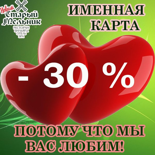 Хотите стать обладателем постоянной 30% скидки на проживание в любом номере нашей гостиницы? Уникальное предложение от ресторанно-гостиничного комплекса Старый Мельник. Именная карта каждому гостю! Преимущества нашей карты: — 30% скидка на проживание в номере любой комфортности; — Бронирование в любой удобный для вас момент (возможность онлайн бронирования); — Подготовка номера к вашему визиту с учетом ваших личных предпочтений. Приезжайте! Доверяйте свой отдых профессионалам!