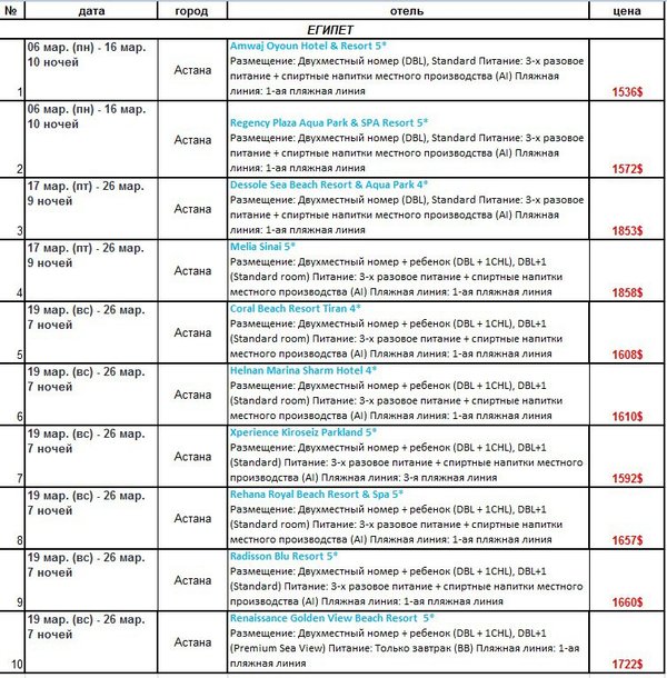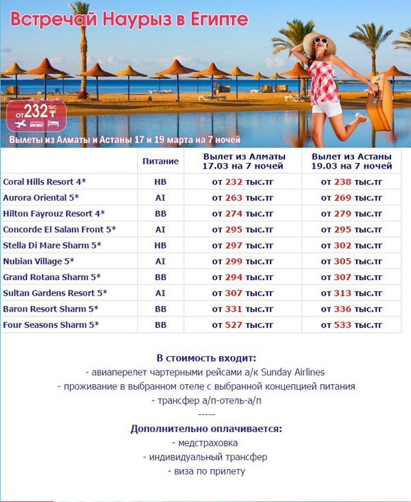 Горячие туры в Египет на апрель Вылет из Алматы от 12.04 на 6—9 ночей Falcon Hills 3* — от 228 тыс.тг, Sharming Inn 4* — от 243 тыс.тг, Amwaj Oyoun 5* — от 247 тыс.тг, Lido Sharm 4* — от 264 тыс.тг, Sultan Gardens Resort 5*-от 319 тыс.тг В стоимость входит: — авиаперелет чартерными рейсами а/к Sunday Airlines — проживание в выбранном отеле с выбранной концепцией питания — трансфер а/п-отель-а/п ---— Дополнительно оплачивается: — медстраховка — индивидуальный трансфер — виза по прилету