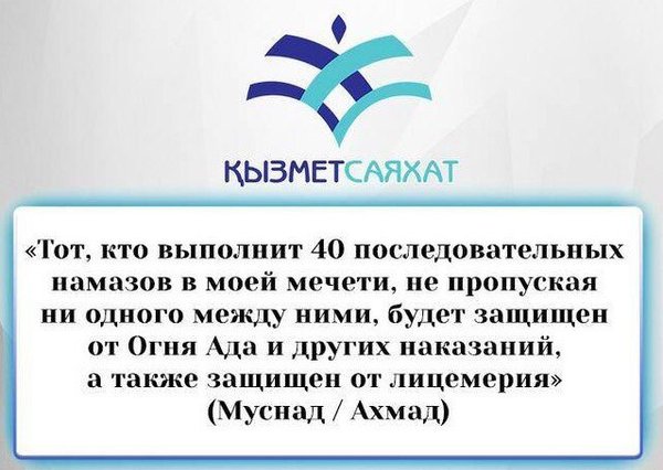 «Мына мешітімде арасын үзбестен қырық уақыт намаз оқыған үшін тозақтан құтылу кепілдігі жазылады» (Тирмизи).