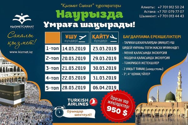 «Қызмет Саяхат» туроператоры НАУРЫЗ айындағы Ұмра күндерін ұсынады: Астана қаласы: 03.03.2017 ️13.03.2017 18.03.2017 ️26.03.2017 21.03.2017 ️30.03.2017 Алматы қаласы: 03.03.2017 ️12.03.2017 10.03.2017 ️19.03.2017 18.03.2017 ️27.03.2017 19.03.2017 ️28.03.2017 21.03.2017 ️30.03.2017 22.03.2017 ️31.03.2017