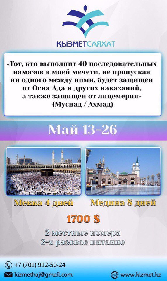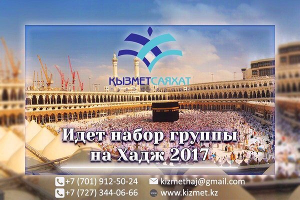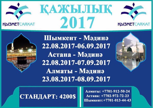 ҚАЖЫЛЫҚ 2016-ға тіркеліу басталды. Набор группы на «Хадж 2016» обьявляется открытым. Астана-Медина 31.08.2016-Жидда-Астана 17.09.2016 Алматы-Медина 01.09.2016-Жидда-Алматы 17.09.2016 Шымкент-Медина 30.08.2016-Жидда-Шымкент 18.09.2016 тел: Алматы тел: Астана