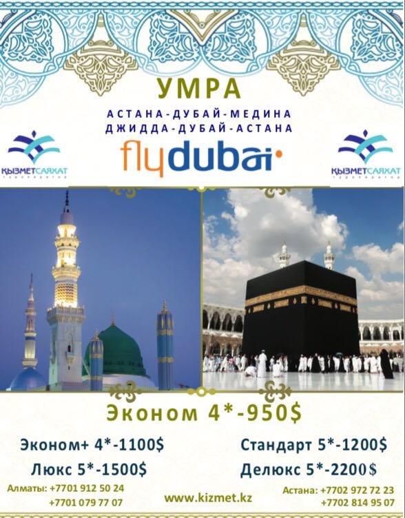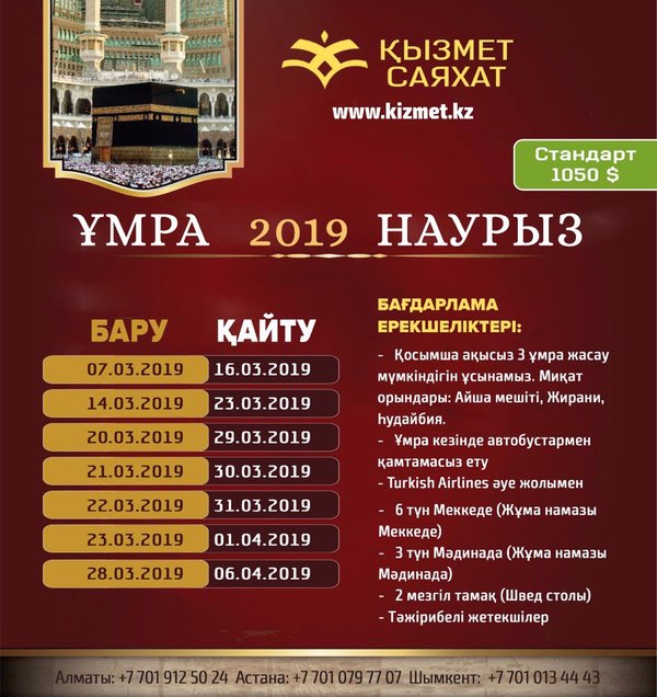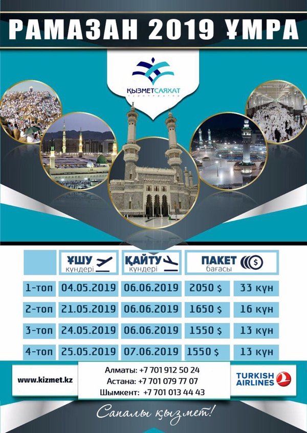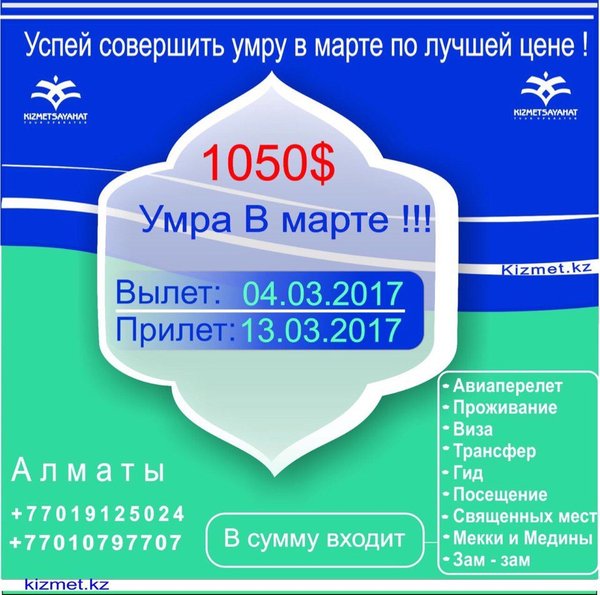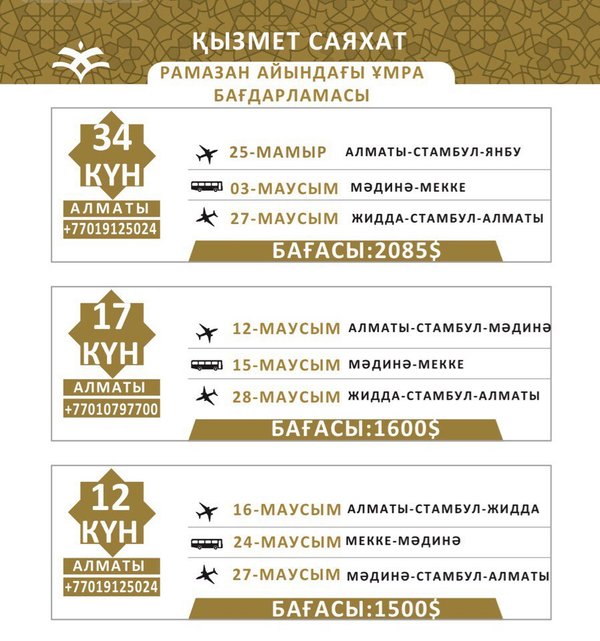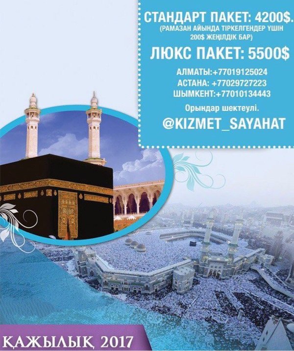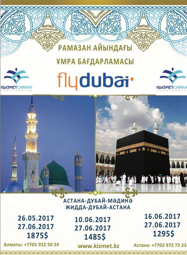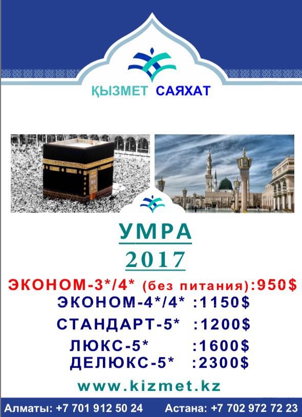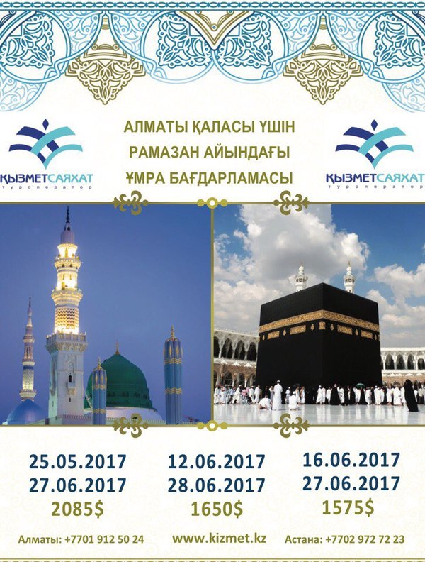 Қазақстанның қажылық саласындағы көшбасшы туроператорының бірі «Қызмет Саяхат» компаниясы Қасиеттi Рамазан айындағы Умра бағдарламасын ұсынады. Алматы қаласынан ️«Turkish Airlines» 25.05.2017•27.06.2017 9-күн Мәдина қаласында 24-күн Мекке қаласында 2085$. 12.06.2017•28.06.2017 3-күн Мәдина қаласында 13-күн Мекке қаласында 1650$. 16.06.2017•27.06.2017 3-күн Мәдина қаласында 9-күн Мекке қаласында 1575$. Алматы: Астана: • 3—4 жұлдызды қонақ үйлер, • Екi мезгiл тамақ (Ауыз ашар жане саресi), • Тәжірибелі жетекшiлер,