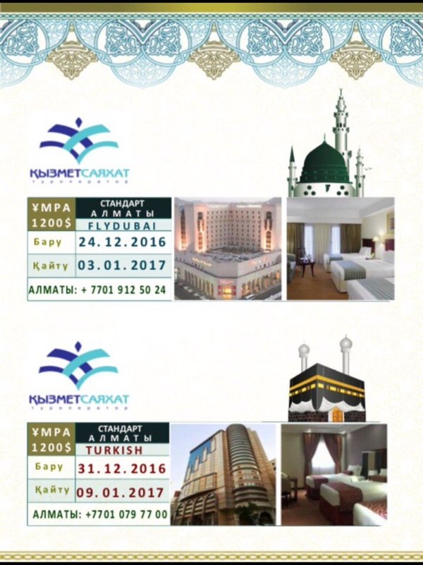 «Қызмет Саяхат» туроператоры Алматы және Астана қалаларынан 15-күндік Умра бағдарламасын ұсынады! 6-күн Мекке қаласында 9-күн Мәдина қаласында немесе 9-күн Мекке қаласында 6-күн Мәдина қаласында. Бағасы:1600$ Мекке қонақ үй: İNFİNİTY5*. Мәдина қонақ үй: MOVENPİC5*. Уақыты: 14/01/2017 ️29/01/2017