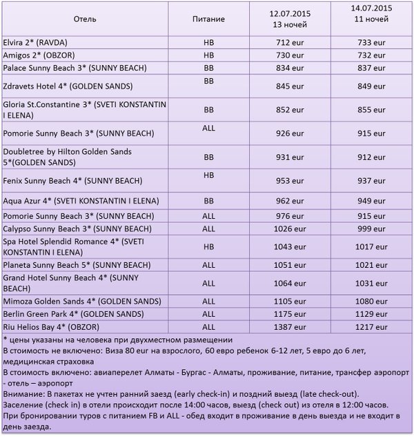 BB от — 550 / 691 / 842 eur Regina 3* (Сол. Берег) BB от — 590 / 763 / 928 eur Tia Maria 3* (Сол. Берег)BB от — 579 / 743 / 904 eur Grand Kamelia & Kamelia Garden (Сол. Берег) BO от — 568 / 724 / 881 eur Melia Grand Hermitage 5* (Зол. Пески) ALL от — 1118 / 1655 / 1922 eur Admiral 5* (Зол. Пески) BB от — 848 / 1160 / 1336 eur Mimosa 4* (Зол. Пески) ALL от — 888 / 1232 / 1422 eur Gladiola 3*/Akacia 3* (Зол. Пески) BB от — 736 / 955 / 1094 eur Ambassador 3* (Зол. Пески) BB от — 715 / 915 / 1047 eur Gradina 3* (Зол. Пески) BB от — 686 / 862 / 985 eur Warshava 2* (Зол. Пески) BB от — 615 / 733 / 832 eur Festa Via Pontica 5* (Поморие)BB от — 730 / 1021 / 1232 eur St. Peter & Pavel 3* (Поморие)BB от — 601 / 783 / 951 eur Bilyana Beach 4* (Несебр&Равда) ALL от — 824 / 1193 / 1435 eur Arsena 4* (Несебр&Равда)ALL от — 795 / 1140 / 1373 eur Vigo 4* (Несебр&Равда) BB от — 658 / 889 / 1076 eur Mellia Ravda Apartments 3* (Несебр&Равда)BO от — 586 / 757 / 920 eur Ekaterina 2* (Равда) (Несебр&Равда)ВО от — 560 / 646 / 733 eur Aparthotel Martinez 4* (Созопол) ALL от — 914 / 1289 / 1490 eur Apolis 3* (Созопол) BB от — 683 / 866 / 991 eur Kandrovi 3* (Созопол) BB от — 640 / 787 / 897 eur Kalithea 3* (Созопол) BO от — 626 / 760 / 866 eur Sozopol 2* (Созопол)BB от — 619 / 747 / 850 eur Бронь по тел.: 272 09 79, 317 96 33, 261 08 42, 261 08 43, 261 08 44