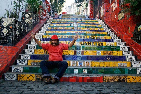 Художник Хорхе Селарон сидит на лестнице под названием Escadaria Selarón (Лестница Селарона), расположенной между районами Рио Лапа и Санта-Тереза. Селарон начал свой проект в 1990 году. Лестница состоит из около 2000 плиток из более 60 стран мира. Художник чилийского происхождения Селарон называет ее данью бразильскому народу.
