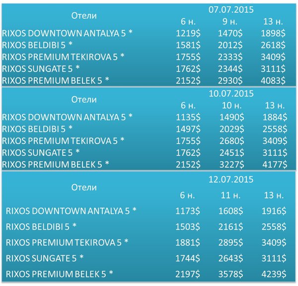 Специальные анимационные программы для детей от сети отелей Rixos: 26 июля — Rixos Premium Tekirova 09 августа — Rixos Sungate 14 августа — Rixos Premium Bodrum Подробнее можно узнать у наших менеджеров по тел.: 272 09 79, 317 96 33, 261 08 42, 261 08 43, 261 08 44