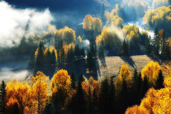 Мистическое озеро Канас на китайской стороне Алтая меняет свой цвет круглый год от серовато-голубого в мае до изумрудного осенью. Вдоль берегов озера, украшенных деревьями всех красок, расположены тувинские деревни, одни из самых красивых в Китае. Сотни домиков среди желтеющих берез и зеленых сосен, локоны дыма над хижинами, ярко-синее небо и густые туманы идеальные декорации для осеннего путешествия.