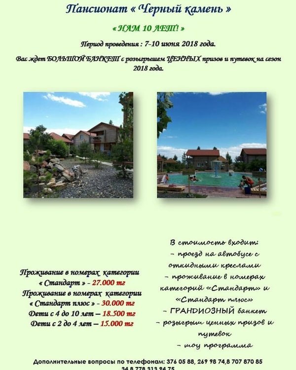 -Каникулы идут полным ходом! -Проведи выходные на Горячих Источниках! -Деревушка -1.11 на сутки -2х местный 2 номера -1.11—3.11 на двое суток -4х местный -7500 с человека в сутки -Ulan Hot Spring -1.11—3.11 на двое суток -2х местный -1.11—02.11 на сутки -2х местный -10000 в сутки с человека -Транспорт на двое суток -1-3 ноября -5000 с человека в оба конца Наши контакты: