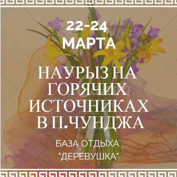 Уважаемые друзья, коллеги и партнеры! Туристическая Компания @tau_komek приглашает Вас посетить город Туркестан и другие Святыни Казахстана в светлый праздник НАУРЫЗ. Программа Сакрального тура рассчитана на 4 дня с выездом из города Алматы Более подробная информация по ссылке: А также празднование Наурыза на Горячих Источниках в п.Чунджа База Отдыха «Деревушка» Более подробная информация по ссылке: Наши контакты: Любое место на планете интересно… Выбери своё!