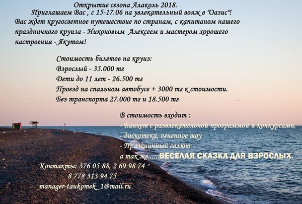Напоминаем, друзья! Мы проводим открытие на озере Алаколь уже не в первый год, а в этом году будет ещё веселее! Открытие сезона на базе отдыха «Оазис»! ️ Проезд на автобусах «спальный», «с откидными креслами». Подробнее по телефонам : 3760588, ️