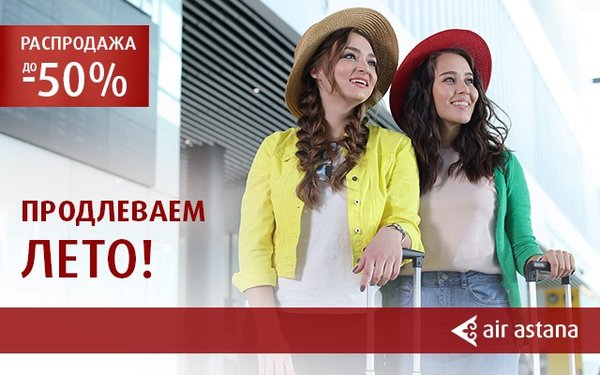Скидка от 50% до 70% в бизнес-класс и до 30% в эконом-класс на международные направления Air Astana! Направления: Франкфурт, Париж, Санкт-Петербург, Москва, Киев, Дубай, Дели, Пекин, Урумчи, Бангкок, Куала-Лумпур, Гонконг, Бишкек, Екатеринбург, Новосибирск, Бишкек, Екатеринбург, Новосибирск, Казань, Тюмень, Омск, Тбилиси, Баку. Период продаж: с 10 по 13 сентября 2018 г. Период путешествия: с 8 октября по 15 декабря 2018 г. Количество билетов ограничено.