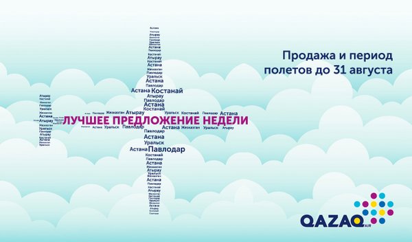Лучшее предложение недели! До конца августа воспользуйтесь лучшим предложением недели от QAZAQ AIR, приобретайте билеты и летайте в период с 15 по 31 августа по наилучшим тарифам на следующие направления: Астана-Костанай от 14 270 тг. Костанай-Астана от 14 880 тг. Астана-Жезказған от 14 950 тг. Жезказған-Астана от 15 250 тг. Астана-Павлодар от 11 030 тг. Павлодар-Астана от 11 410 тг. Атырау-Уральск от 12 530 тг. Уральск-Атырау от 12 120 тг.