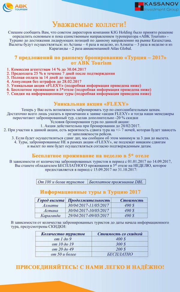 Друзья, в 2017 году мы решили сконцентрироваться на Турции. Мы максимально приложим все усилия для достижения наилучших цен на рынке. Подписывайтесь на нашу рассылку! Мы всегда рады новым партнёрам и плодотворному сотрудничеству! res@abktourism.kz