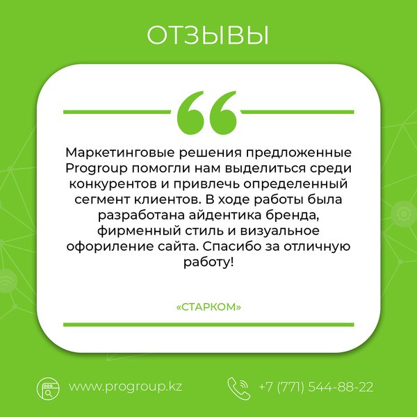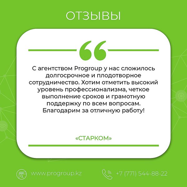 Отзыв: компания «СТАРКОМ» ⠀ Благодарим за отзыв, были рады плодотворному сотрудничеству! ⠀ ️ ️ Алматы, ул. Айманова, 220 progroup.kz